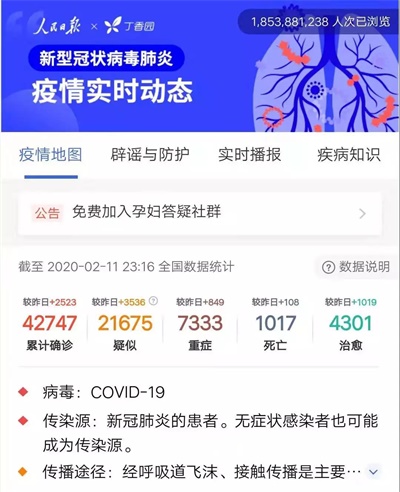 今年的春节比较特殊,疫情像一个无声无形的幽灵正笼罩在众人的心坎上。截止2020年2月11日23:16,全国累计新型冠状病毒感染的肺炎确诊病例42747例,疑似21675例,死亡1017例。