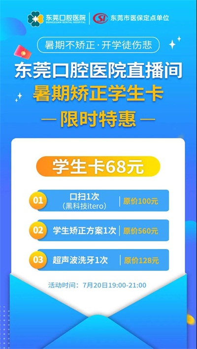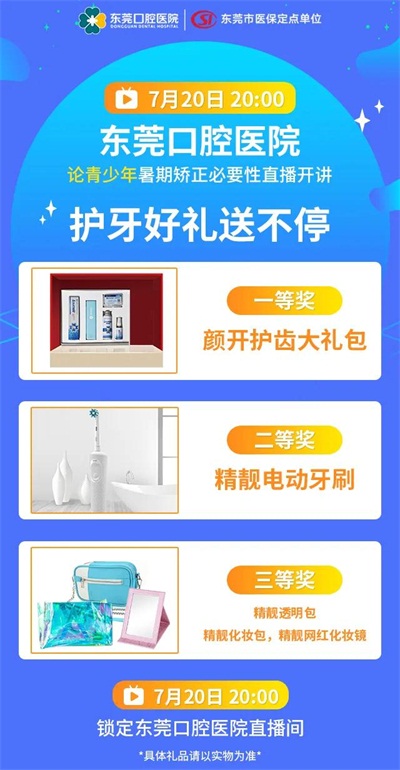 为了让青少年享受更好、更专业的口腔健康服务,东莞口腔医院于7月20日(下周一)晚8点开启一场关于暑期牙齿矫正的直播活动,普及牙列不齐等相关知识,倡导青少年及家长重视口腔健康、牙齿发育情况,及早预防、发现、治疗。听院长袁东辉教授讲解数字化牙齿矫正技术,让广大青少年早日绽放青春笑容。来直播间边看边提问,免费抽奖赢大礼!