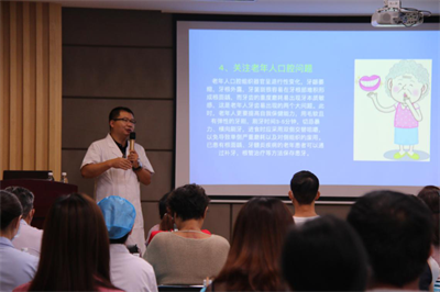 中国的人口老龄化的程度持续加深,老年人口在快速增加。在应对这一庞大的老年群体给中国社会带来的挑战中,老年健康无疑是重要内容。而口腔健康的改善有利于老年人群的整体健康状况。因此东莞口腔医院借在全国爱牙日举办了关于中老年人的口腔保健的讲座,讲座内容分为三大部分:口腔健康与全身健康的关系、牙齿的日常维护、缺牙的佳修复方法——种植牙。
