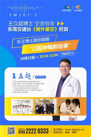百善孝为先,重阳节将至,这是孝敬长者的节日,是我们关心父母,表达孝心的好机会。给父母买一堆保健品,不如陪他们种牙,让他们能享好口福,牙好,身体好。为了让更多人了解佳的牙齿缺失修复方法——种植牙,东莞口腔医院荣誉院长兼种植科主任王立超博士受邀做客东莞交通电台《窗外星空》栏目,10月22日晚上20:30—22:00为大家解密种植牙那些事~