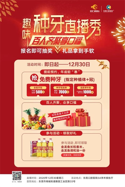 12月30日,趣味种牙直播秀 百人齐聚享口福 ——暨东莞口腔医院第六届种牙直播,届时,现场抽免费种植牙,品精美下午茶,体验数字化口腔精确诊疗服务及王立超博士专家团一对一亲诊,还有储值礼、护齿礼包、抽奖券,奖品丰厚,福利多多。