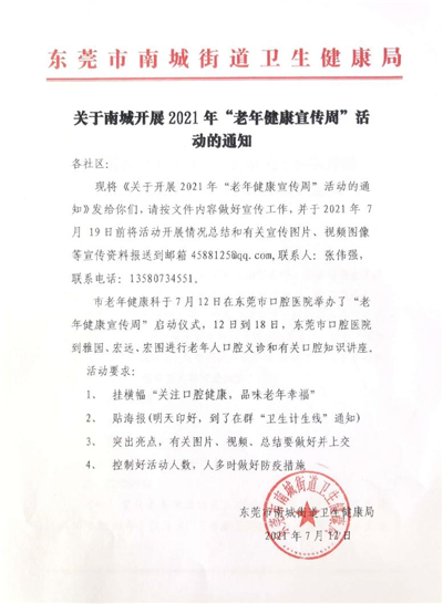 2021年7月12日-7月18日是全国第三个老年健康宣传周,主题为“关注口腔健康,品味老年幸福”,旨在宣传普及老年健康政策和科学知识,切实提高老年人健康素养和健康水平,全面推进健康中国建设。东莞市卫健局于7月12日在东莞口腔医院举办了东莞市2021年健康宣传周活动启动仪式,东莞口腔医院将配合市卫健局在老年健康宣传周开展系列相关活动。