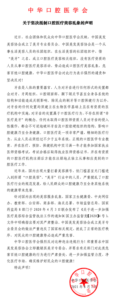在此,东莞口腔医院坚决支持中华口腔医学会的声明,坚决抵制和反对有关严重扰乱口腔医疗行业规范发展、对人民群众口腔健康乃至全身其他系统健康带来危害及口腔医疗商业化乱象和非法行医等行为。同时呼吁大家,为了健康一定要选择正规的口腔专科医院或口腔科,选择具备执业医师资格证的医师进行诊疗。
