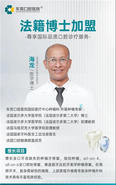法国籍种植专家海龙(Patrice Flavien RAIVO)医学博士加盟东莞口腔医院,这将进一步提升医院的整体治疗水平,使医院与世界接轨,东莞市民不出国门就能得到国际专家的诊疗服务和手术治疗。