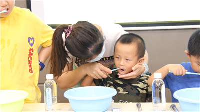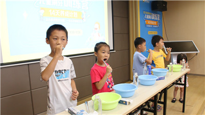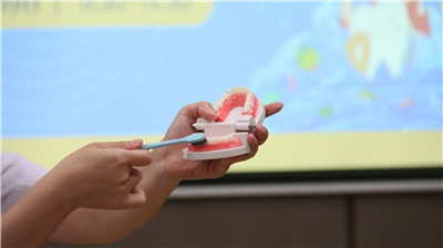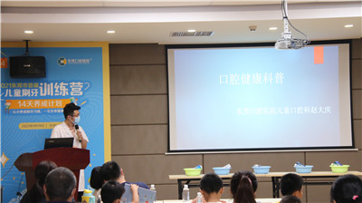 训练营邀请了东莞口腔医院儿童口腔科主任赵大庆医生为家长和小朋友们讲解蛀牙、口腔不良习惯等儿童口腔常见问题,并用模型为小朋友们讲解正确的刷牙方法。医生推荐6岁以上的小朋友和各位家长使用“巴氏刷牙法”刷牙,具体操作是刷牙齿外侧时刷牙与牙根呈45°上下拂刷,以2-3颗牙为一组短距离,水平颤动牙刷,牙齿的内侧也使用同样的方法;刷咬合面时,牙刷与咬合面垂直;刷前牙内侧面,将牙刷竖起来,上排牙向下,下排牙向上提拉轻刷;保证牙齿的每一个面:正面、内侧面及咬合都刷到。