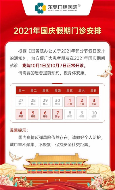国庆小长假将至,东莞口腔医院在此向广大患者朋友们致以真挚的节日问候,祝大家身体安康!