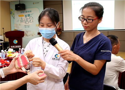 洁牙师翁紫茹先为大家简单介绍了牙周病相关知识,然后与赵莉博士共同演示正确刷牙、使用牙线和牙间隙刷的方法,大家都听得非常认真。