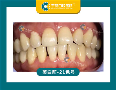 牙齿情况:外源性黄牙,牙齿比色21色号