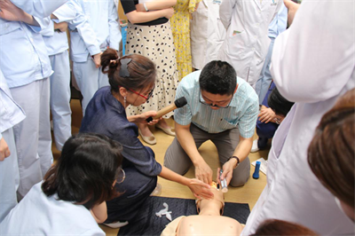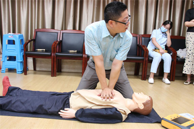 凌医生从理论知识和实践操作两个方面展开授课。首先介绍了常见的突发事件,如心脏骤停、气道异物阻塞、药物过敏反应、晕厥、低血糖症等症状及处理的方法,并详细讲解了心肺复苏、开放气道等急救措施的操作方法。