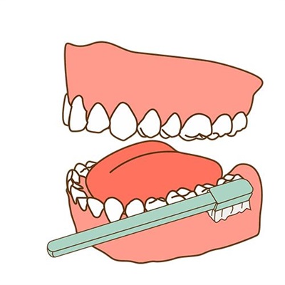 需要将牙刷毛倾斜45°放在牙齿和牙龈交接处,手腕轻微用力,以2~3颗牙齿为一组短距离水平颤动,然后向牙冠处轻柔拂动;整个过程不少于3分钟。