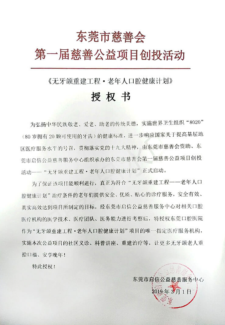 为实施世界卫生组织“8020”(80岁拥有20颗可使用的牙齿)的健康标准,进一步响应国家关于提高基层地区医疗服务水平的号召, 贯彻落实党的十九大精神,东莞市启信公益慈善服务中心、东莞口腔医院联合启动了东莞市首届创投“ 无牙颌重建工程·老年人口腔健康计划”公益项目,向全市征集缺失牙案例,为其提供专业的治疗服务援助,以提高老人晚年生活质量, 并带动更多的企事业机构和爱心人士投身到关爱老年人口腔健康的行列当中,为共筑中国梦、健康梦而贡献自己的一份力量。